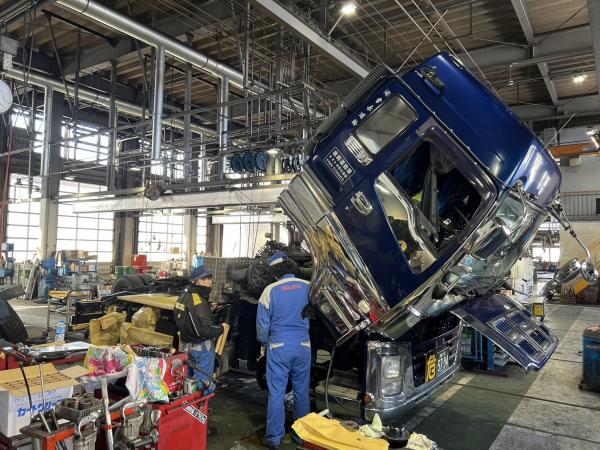 トラックの整備と聞くと、部品が大きくて重労働のイメージがあるかもしれませんが、当社の整備工場は、重量物を持ち上げるための補助器具どの設備が整っており、作業をスムーズに行うことができます。